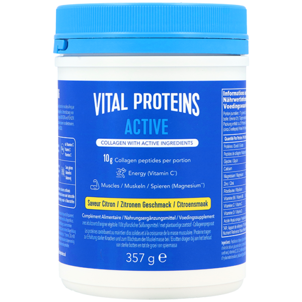 'Active' collageenpeptidenpoeder met citroensmaak Verrijkt met actieve ingrediënten zoals calcium, magnesium, zink, vitamine C, D en B-vitaminen Vitamine C, B2 en B6 ondersteunen het energieniveau, magnesium draagt bij…