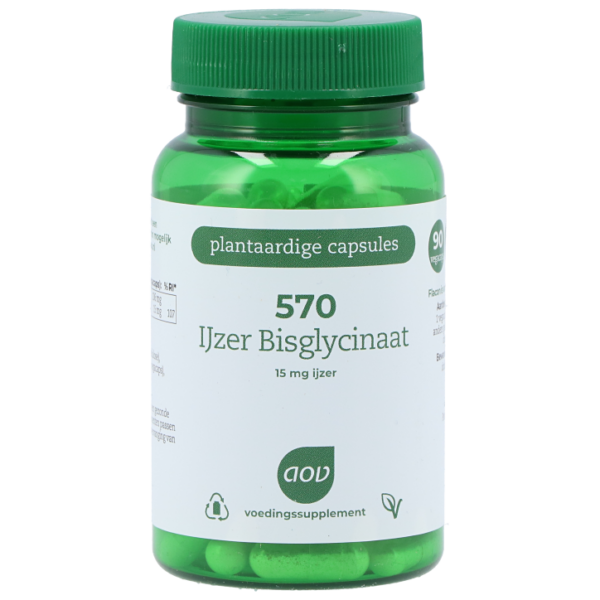Voedingssupplement met ijzerBevat 15 mg goed opneembaar ijzer per vegacapsIJzer draagt bij aan een normaal concentratievermogen en geheugenAOV 570 IJzer Bisglynaat bevat 15 mg goed opneembaar ijzer per vegacaps.