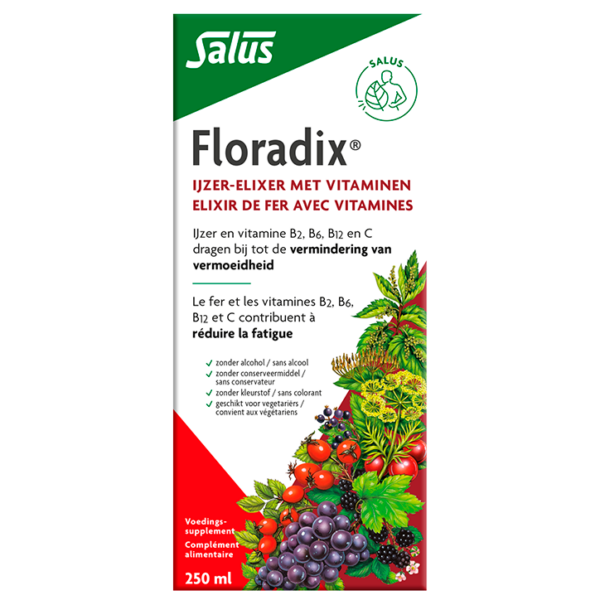 Floradix, ook wel bekend als een vloeibare ijzerdrank of ijzerelixer, is aangevuld met groentenextracten en vruchtenconcentraten.