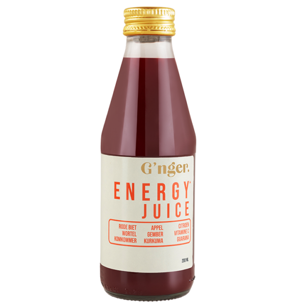 Sapmix met maar liefst 75% groenten Met rode biet, wortel, komkommer, appel, gember, kurkuma en citroen Met vitamine C en guarana, hoog cafeïnegehalte Ontdek G’nger Energy Juice: een verrassend frisse blend van groente-…