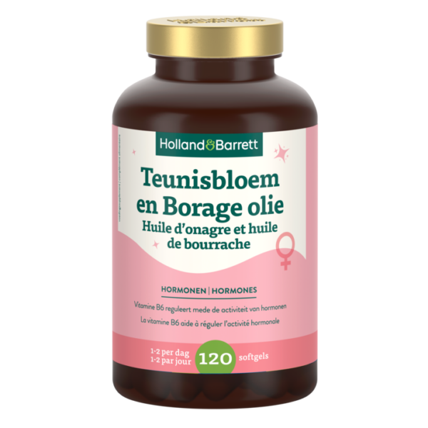 Voedingssupplement met teunisbloemolie, borageolie en vitamine B6Vitamine B6 reguleert mede de activiteit van hormonenMet 120 capsules kan je tot wel 4 maanden vooruitHolland Barrett Teunisbloemolie en Borageolie bevat…