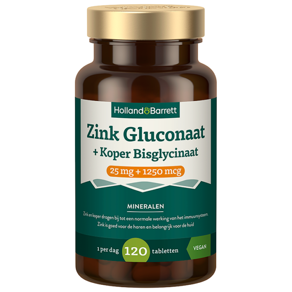 Holland & Barrett Zink Gluconaat 25mg + Koper Bisglycinaat 1250mcg - 120 tabletten