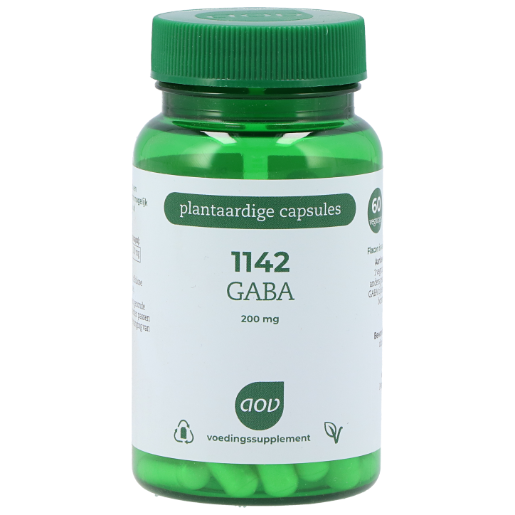 1142 GABA bevat 200 mg GABA per vegacaps Plantaardige capsules met zo min mogelijk hulp- en vulstoffen Vrij van geur-, kleur- en smaakstoffenGABA is een aminozuur en is een afkorting van gamma-amino-boterzuur. Deze lichaamseigen stof kan ons ondersteunen bij het vinden van rust en in het omgaan met stress. Neurotransmitters zijn lichaamseigen, chemische signaalstoffen, een soort ‘boodschappers’ die signalen doorgeven in onze hersenen en zo verschillende processen in ons lichaam regulerenDe supplementen van AOV zijn verpakt in een groene verpakking. Deze zijn gemaakt van 100% gerecycled plastic, ook wel rPET genomed. Op deze manier hoeft er geen nieuw plastic geproduceerd te worden.