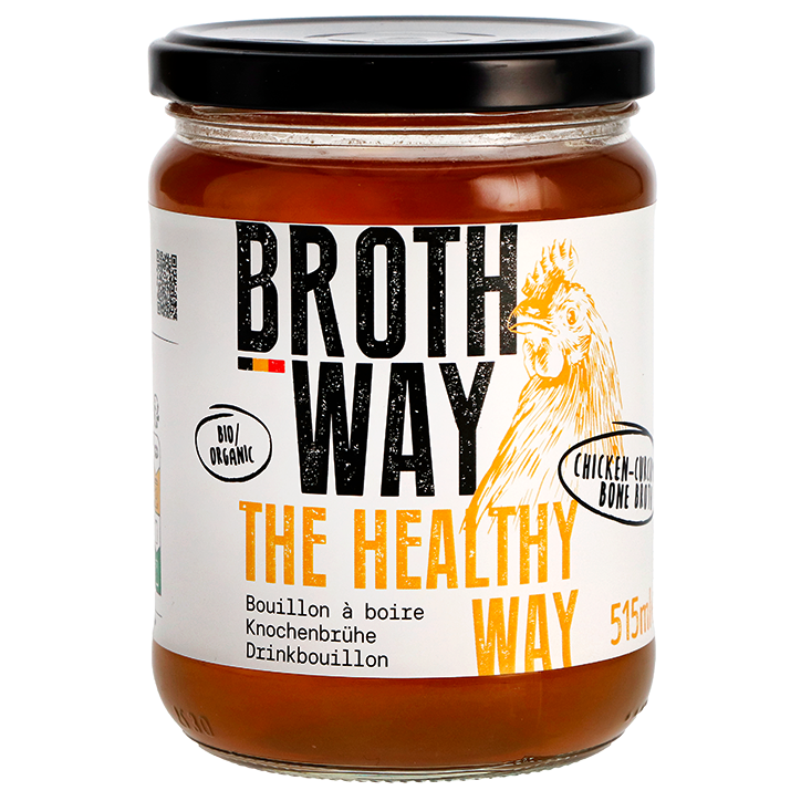 Bottenbouillon verrijkt met kurkuma voor een smaakvolle en gezonde twistRijk aan proteïnen en arm aan vet koolhydraten, perfect als onderdeel van een gezondheidskuurBiologisch, glutenvrij en zonder toegevoegde bewaarmiddelenOntdek de heilzame kracht van Brothway Chicken-Curcuma Bone Broth, een klassieker met een boost. Elke flesje van 515 ml levert een flinke dosis collageen. Deze lichaamseigen stof speelt een rol in de stevigheid van je botten, spieren en huid.De toevoeging van kurkuma verrijkt niet alleen de smaak, maar brengt ook bioactieve stoffen in je dieet. Ideaal voor na het sporten of als een verkwikkende pauze op een drukke dag. Eenvoudig te verwarmen op een zacht vuurtje of in de magnetron voor een snelle en voedzame snack.Met 100% biologische ingrediënten en een zorgvuldig bereidingsproces, staat Brothway garant voor een pure, natuurlijke smaak zonder kunstmatige toevoegingen. Na openen in de koelkast bewaren en binnen drie dagen gebruiken. De verpakking is duurzaam en volledig recyclebaar.De bouillons van worden op artisanale wijze gemaakt, zonder smaakversterkers of bewaarmiddelen. Bij de producten spelen verse kruiden groenten en vers vlees beenderen de hoofdrol. De voedingsstoffen en lekkere smaken komen volledig vrij na een inkookproces variërend van 30 tot maar liefst 72 uur, waarna het eindproduct zorgvuldig wordt gefilterd om alle overtollige vetten te vermijden. Wist je dat je bottenbouillon ook uitstekend kunt gebruiken om mee te koken? Het kan de perfecte basis vormen voor veel gerechten en zorgen voor een diepe, rijke smaak. Je kunt bottenbouillon onder meer gebruiken voor soepen, stoofschotels, sauzen, risotto en marinades, maar experimenteer vooral zelf met de vele mogelijkheden!