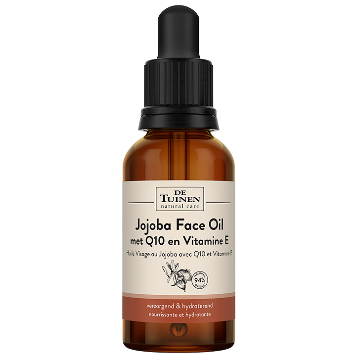 Verzorgende jojoba gezichtsolie met Q10 en vitamine EOndersteunt de huidelasticiteit en houdt de huid soepelTrekt snel in en laat geen vettig laagje achterDe Tuinen Jojoba Gezichtsolie Q10 Vitamine E is een voedende gezichtsolie die de huid helpt verzorgen en verzachten. Dankzij de jojoba-olie voelt je huid soepel aan. De lichte, niet-vette textuur maakt deze olie ideaal voor dagelijks gebruik, zelfs onder make-up.De toevoeging van Q10 en vitamine E ondersteunt de huidbarrière en helpt de huid er vitaal uit te laten zien. Jojoba-olie is populair vanwege de milde werking en brede inzetbaarheid. De olie is geschikt voor verschillende huidtypes, van normaal tot droog.Breng een paar druppels aan op een schone huid of meng de olie met je dag- of nachtcrème. Deze jojoba gezichtsolie is ideaal voor wie op zoek is naar milde, dagelijkse verzorging.