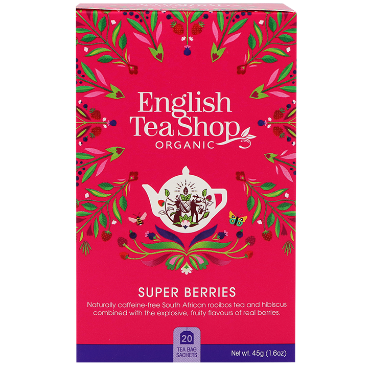 Biologische hibiscusthee met bessen Fruitige melange met aardbeien, bosbessen en frambozen Biologisch gecertificeerd Geniet van de levendige en fruitige smaak van English Tea Shop Super Berries. Deze geurige theemelange combineert de diepe, lichtzure tonen van hibiscus met de zachte zoetheid van rooibos, aardbeien, bosbessen en frambozen. Het resultaat is een frisse en volle thee die perfect is om op elk moment van de dag van te genieten. De natuurlijke frisheid van bessen en de subtiele kruidige ondertonen maken deze thee een smaakvolle en aromatische keuze. Hij is heerlijk zowel warm als koud, ideaal als oppepper in de ochtend of als verfrissend drankje in de middag. Deze thee is biologisch gecertificeerd en zorgvuldig samengesteld voor een rijke en uitgebalanceerde smaakervaring.