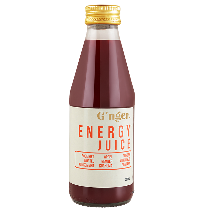Sapmix met maar liefst 75% groenten Met rode biet, wortel, komkommer, appel, gember, kurkuma en citroen Met vitamine C en guarana, hoog cafeïnegehalte Ontdek G’nger Energy Juice: een verrassend frisse blend van groente- en vruchtensappen die je smaakpapillen prikkelt en je meteen laat opleven. Deze dynamische mix bestaat voor maar liefst 75% uit groenten en is verrijkt met gember, kurkuma en fruit. Ideaal voor wie zin heeft in een verfrissend sap met een energieke twist. De zoetheid van rode biet vormt de basis van deze blend en combineert perfect met de frisse tonen van wortel en komkommer. Appelsap zorgt voor een zachte, fruitige afronding, terwijl gembersap en kurkuma een volle smaak geven met een lichtpittige kick. Een harmonieuze combinatie die je op elk moment van de dag verfrist en verrast. Naast de uitgesproken smaak bevat Energy Juice ook vitamine C, dat bijdraagt tot een normaal energieleverend metabolisme. Guarana maakt de formule compleet en zorgt voor een hoog cafeïnegehalte: het drankje bevat 32 mg cafeïne per 100 ml (64 mg per flesje van 200 ml). Daardoor is dit product niet aanbevolen voor kinderen of voor vrouwen die zwanger zijn of borstvoeding geven. Schudden voor gebruik. Koel en droog bewaren. Na openen gekoeld bewaren en binnen 2 dagen consumeren.