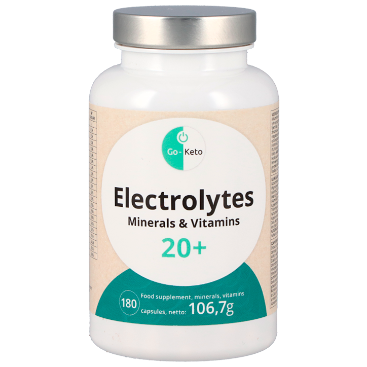 Supplement met elektrolyten en vitaminenSupplement met elektrolyten en vitaminenEssentiële mineralen, perfect voor tijdens een ketodieetGo-Keto Elektrolyten vult de mineralen aan die je lichaam verliest bij de overgang naar ketose. Ideaal voor tijdens een keto-dieet. Elektrolyten zijn nodig om veel van de biologische processen van het lichaam mogelijk te maken en gehydrateerd te kunnen blijven.Go-Keto Elektrolyten bevat meer dan 20 verschillende mineralen en vitamines: natrium, chloride, kalium, magnesiumcitraat, fosfor, calcium, ijzer, koper, mangaan, zink, jodium, selenium, biotine vitamine C, D3, E, A, B1, B2, B3, B5, B6, B12 en Foliumzuur.Gebruik: neem 3 capsules per dag in met veel water. Houd je aan de aanbevolen dosering.