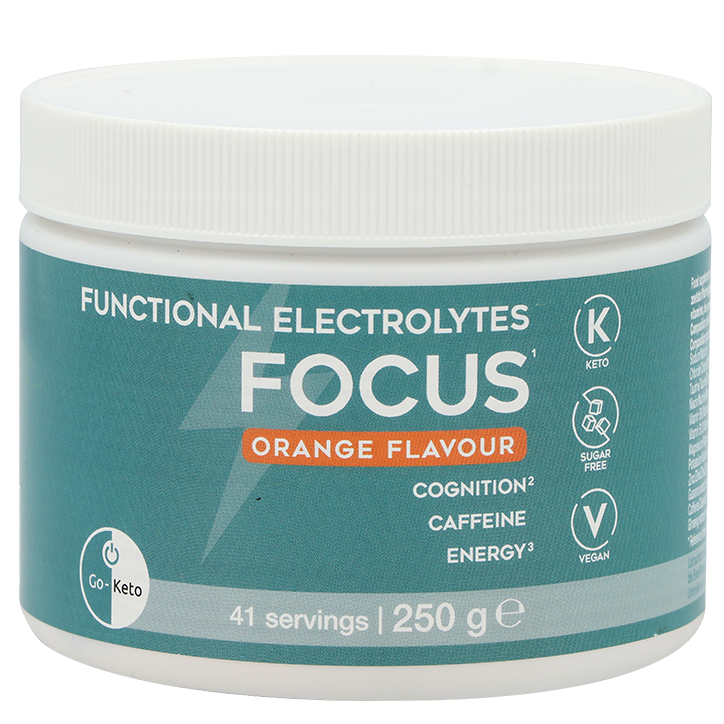 Keto-vriendelijk en suikervrij elektrolytencomplex met sinaasappelsmaak Met cafeïne, guarana-extract en ginsengextract Magnesium, vitamine B3, B6 en B12 dragen bij aan een normale psychologische functie Op zoek naar een frisse start van je dag? Go-Keto Functional Electrolytes Focus Orange is speciaal ontwikkeld voor iedereen met een actieve levensstijl of ketogene voeding. Deze elektrolytenmix bevat onder meer cafeïne, guarana en ginseng. De formule bevat daarnaast magnesium, wat bijdraagt tot een goede elektrolytenbalans. Vitamine B6 en B12 helpen bij de vermindering van vermoeidheid en dragen bij aan een normaal energieleverend metabolisme. Dankzij de sinaasappelsmaak, gezoet met stevia, geniet je van een verfrissend drankje zonder suiker of kunstmatige toevoegingen. Met 41 porties per verpakking biedt Go-Keto Focus Orange een uitstekende prijs-kwaliteitsverhouding. Perfect voor tijdens het sporten of op drukke dagen. Meng 1 portie (6 gram) met 300 ml water. Goed roeren of schudden tot het volledig is opgelost.
