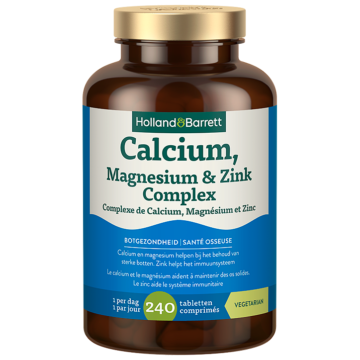 Vegetarisch voedingssupplement met calcium, magnesium en zink Calcium en magnesium helpen bij het behoud van sterke botten Zink helpt het immuunsysteem Holland Barrett Calcium, Magnesium en Zink is een vegetarisch vitaminen- en mineralencomplex. Het complex bevat calcium en magnesium wat goed is voor het skelet. Calcium bevindt zich vooral in de botten en speelt daar een rol bij de botaanmaak. Bovendien is calcium belangrijk voor een normale spierwerking. Magnesium ondersteunt de botten en zorgt mede voor de spieren. Daarnaast bevat dit complex zink en vitamine D3. Zink is goed voor het skelet en ondersteunt het immuunsysteem. Vitamine D3 verhoogt de opname van calcium in de botten. Holland Barrett Calcium, Magnesium Zink Complex is geschikt voor vegetariërs. Door de optimale dosering hoef je maar 1 tablet per dag in te nemen, bij voorkeur tijdens een maaltijd. De verpakking is gemaakt van 100% gerecycleerd plastic. Bovendien zijn pot en dop beide 100% recyclebaar.