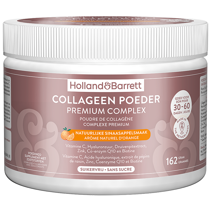 Helpt bij de verzorging van de huid van binnenuitBevat vitamine C, hyaluronzuur, druivenpitextract, zink, co-enzym Q10 en biotineCollageen vermindert de zichtbare tekenen van verouderingWist je dat het huidverouderingsproces al op 25-jarige leeftijd wordt ingezet? Dat heeft voor een groot stuk te maken met de vertraging van onze collageenproductie. Collageen is het eiwit dat structuur en elasticiteit geeft aan onze huid.Dit voedingssupplement bevat vitamine C, hyaluronzuur, druivenpitextract, zink, co-enzym Q10 en biotine. Zink helpt bij de verzorging van de huid van binnenuit en is goed voor de nagels en haren. Vitamine C draagt bij aan de vorming van collageen, wat helpt de huid te verstevigen. En door de sinaasappelsmaak is het premium collageencomplex van Holland Barrett nog lekker ook!Neem dagelijks minimaal 2,7 gram Holland Barrett Collageen Poeder Premium Complex. Wij adviseren een dosering van 5,4 gram poeder per dag. Meng de gewenste hoeveelheid met 250 ml water. Laat het poeder 5 minuten oplossen en roer indien nodig.