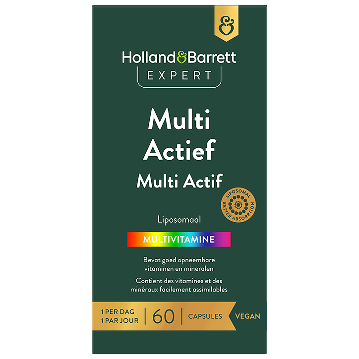 Vegan, liposomaal multivitaminencomplexVitamine B1, B2, B3, B5, B6, B12, biotine, vitamine C en ijzer ondersteunen het energieniveauIdeale aanvulling op een gezond en gevarieerd voedingspatroonBen je op zoek naar een goed-opneembaar multivitaminencomplex ter aanvulling op een gezonde en gevarieerde voeding? Met Holland Barrett Expert Multi Actief Liposomale Multivitamine krijg je in 1 capsule maar liefst 20 verschillende vitamines en mineralen binnen. Deze liposomale multivitamine wordt beschermd tegen vroegtijdige afbraak, waardoor de vitamines en mineralen extra goed opneembaar zijn door het lichaam.20 verschillende vitamines en mineralenDit multivitaminencomplex van de Holland Barrett Expert-lijn bevat 100 mg vitamine C (125% van de adh), 15 mg vitamine E (125% van de adh), 15 mg vitamine B3 (94% van de adh), 7,5 mg vitamine B5 (125% van de adh), 864 microgram vitamine A (108% van de adh), 1,75 mg vitamine B6 (125% van de adh), 1,5 mg vitamine B2 (107% van de adh), 1,4 mg vitamine B1 (127% van de adh), 50 microgram vitamine B12 (2000% van de adh), 10 microgram vitamine D3 (200% van de adh), 200 microgram folaat (100% van de adh), 100 microgram biotine (200% van de adh), 50 microgram chroom (125% van de adh), 12 mg magnesium (3% van de adh), 10 mg zink (100% van de adh), 62,5 microgram selenium (114% van de adh), 0,5 mg mangaan (25% van de adh), 1 mg koper (100% van de adh), 100 microgram vitamine K2 (133% van de adh) en 14 mg ijzer (100% van de adh).Ondersteun je energieniveau en je weerstandAl deze vitamines en mineralen spelen een belangrijke rol bij tal van processen in het lichaam. Zo ondersteunen vitamine B1, B2, B3, B5, B6, B12, biotine, vitamine C en ijzer het energieniveau en helpen onder meer vitamine C, ijzer en vitamine B12 het immuunsysteem.Holland Barrett Expert Multi Actief Liposomale Multivitamine bevat 60 vegan capsules per verpakking. 1 keer per dag 1 capsule met water innemen, bij voorkeur tijdens de maaltijd. De verpakking is gemaakt van 100% gerecycleerd plastic. Bovendien zijn pot en dop beide 100% recyclebaar.De producten van de Holland Barrett Expert-lijn zijn zorgvuldig samengesteld met hoogwaardige ingrediënten en maken gebruik van innovatieve technieken. Waar mogelijk bevatten de supplementen ingrediënten in hun biologisch actieve vorm, waardoor ons lichaam ze niet meer hoeft om te zetten. Bovendien streven we naar een optimale samenstelling van ingrediënten, zodat ze elkaar aanvullen en ondersteunen. Dankzij deze zorgvuldige formulering is het gebruik van onze Expert-supplementen vaak extra eenvoudig: meestal is één capsule of tablet per dag voldoende. Check voor de zekerheid altijd het label.
