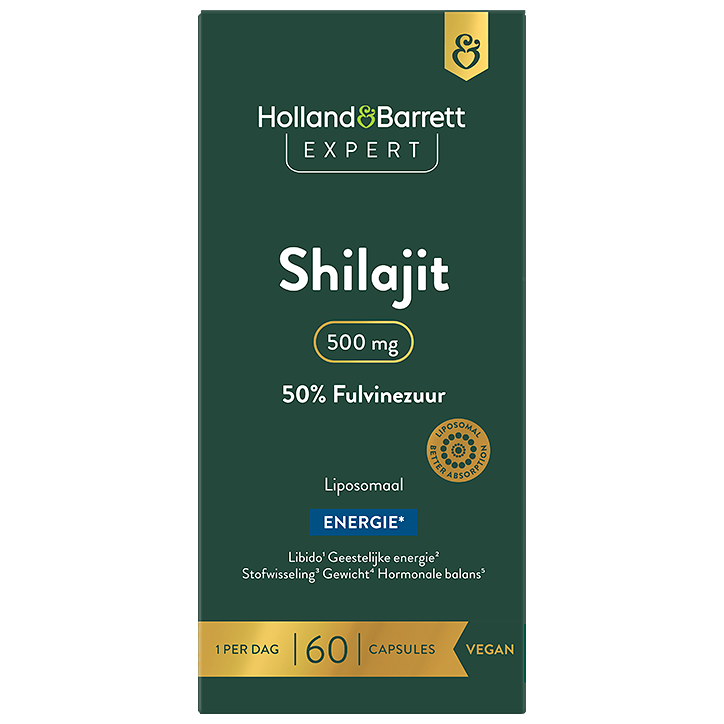 Vegan capsules met 500 mg shilajit per capsule, gestandaardiseerd op 50% fulvinezuurOndersteunt de seksuele functie en libido bij zowel mannen als vrouwen*Kan bijdragen aan verbeterde energieniveaus* en normale mentale prestaties*Ontdek de kracht van shilajit, een zeldzaam natuurlijk extract gevonden in de hoge bergen, dat al duizenden jaren wordt gebruikt voor zijn unieke eigenschappen. Holland Barrett Expert Shilajit biedt een krachtig extract met 500 mg shilajit per capsule, gestandaardiseerd op 50% fulvinezuur, de belangrijkste werkzame stof in shilajit.Shilajit staat bekend om zijn ondersteunende effecten op de seksuele functie en het libido*, energieniveau* en normale mentale prestaties*, terwijl het ook kan helpen bij het ondersteunen van de stofwisseling* en het bevorderen van een gezonde hormonale balans.*Holland Barrett Expert Shilajit bevat 60 capsules per verpakking. 1 capsule per dag met water innemen, bij voorkeur tijdens de maaltijd. De verpakking is gemaakt van 100% gerecycleerd plastic. Bovendien zijn pot en dop beide 100% recyclebaar.De producten van de Holland Barrett Expert-lijn zijn zorgvuldig samengesteld met hoogwaardige ingrediënten en maken gebruik van innovatieve technieken. Waar mogelijk bevatten de supplementen ingrediënten in hun biologisch actieve vorm, waardoor ons lichaam ze niet meer hoeft om te zetten. Bovendien streven we naar een optimale samenstelling van ingrediënten, zodat ze elkaar aanvullen en ondersteunen. Dankzij deze zorgvuldige formulering is het gebruik van onze Expert-supplementen vaak extra eenvoudig: meestal is één capsule of tablet per dag voldoende. Check voor de zekerheid altijd het label.*Gezondheidsclaims in afwachting van goedkeuring door de Europese Commissie.