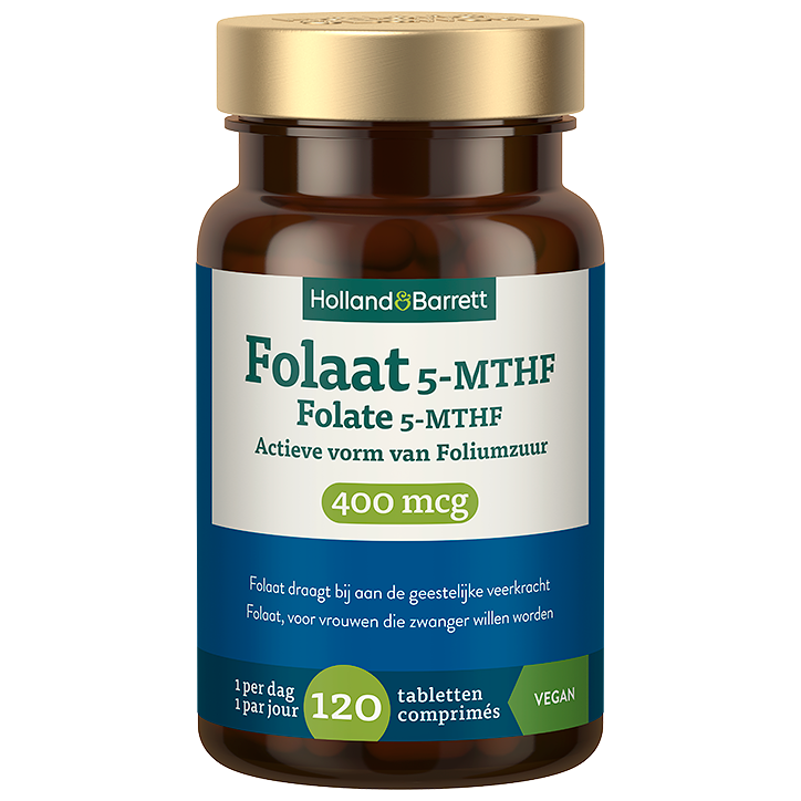 Vegan voedingssupplement met folaat 5-MTHF, een actieve vorm van foliumzuurFolaat draagt bij aan de weerstand tegen stress, de weefselgroei tijdens de zwangerschap en helpt het immuunsysteemFolaat is ook goed bij vermoeidheidHolland Barrett Folaat 5-MTHF 400mcg is een vegan voedingssupplement met folaat, ook wel vitamine B11 genoemd. Folaat 5-MTHF is een biologisch actieve vorm van foliumzuur en wordt goed opgenomen door ons lichaam.Folaat, ook wel vitamine B11 genoemd, draagt bij aan de weerstand tegen stress, speelt een rol in het celdelingsproces, draagt bij tot de normale aminozuursynthese, ondersteunt de aanmaak van rode en witte bloedlichaampjes, ondersteunt de afweer van het lichaam, draagt bij aan een heldere geest en is goed bij vermoeidheid. Omdat folaat ook bijdraagt tot de weefselgroei tijdens de zwangerschap, is dit met name ook voor zwangere vrouwen een belangrijke vitamine.Holland Barrett Folaat 5-MTHF 400mcg is geschikt voor vegetariërs en veganisten. De aanbevolen dagdosering is 1 tablet per dag, bij voorkeur tijdens de maaltijd innemen. De verpakking is gemaakt van 100% gerecycleerd plastic. Bovendien zijn pot en dop beide 100% recyclebaar.