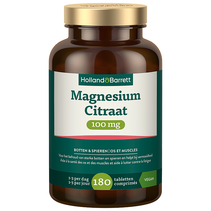 Vegan magnesiumcitraat tabletten Voor het behoud van sterke botten spieren en helpt bij vermoeidheid Per tablet 100 mg goed opneembaar magnesium Wist je dat pure magnesium niet goed door het lichaam kan worden opgenomen? Magnesiumcitraat is een goed alternatief, want deze combinatie van magnesium en citroenzuur wordt beter door het lichaam opgenomen dan pure magnesium. Holland Barrett Magnesium Citraat bevat 100 mg magnesium per tablet, wat goed is voor 27% van de aanbevolen dagelijkse hoeveelheid. Magnesium is betrokken bij meerdere processen in het lichaam. Magnesium helpt onder meer bij vermoeidheid, draagt bij aan de instandhouding van sterke botten spieren, is goed voor het concentratievermogen en helpt energie vrij te maken uit de voeding. 1 tot 3 tabletten per dag innemen, bij voorkeur bij een maaltijd. De verpakking is gemaakt van 100% gerecycleerd plastic. Bovendien zijn pot en dop beide 100% recyclebaar.