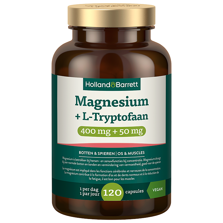 Vegan voedingssupplement met magnesium, 50 mg L-tryptofaan en vitamine B6 als co-enzym P-5-PMagnesium en vitamine B6 zijn betrokken bij hersen- en zenuwfuncties bij concentratieMagnesium draagt bij aan vermindering van vermoeidheid en is goed voor de spierenHolland Barrett Magnesium + L-Tryptofaan 400mg + 50mg is een vegan voedingssupplement met magnesium, L-tryptofaan en vitamine B6 als co-enzym P-5-P.Eén capsule bevat 400 mg magnesium. Magnesium is een belangrijk mineraal dat bijdraagt aan de instandhouding van sterke botten en de werking van je spieren. Daarnaast helpt magnesium bij vermoeidheid en is het goed voor je concentratievermogen, geheugen en gemoedstoestand. L-Tryptofaan is een essentieel aminozuur. Co-enzym P-5-P, ook bekend als pyridoxaal-5-fosfaat, is de actieve vorm van vitamine B6. Vitamine B6 ondersteunt het immuunsysteem en bevordert de energiestofwisseling.Holland Barrett Magnesium + L-Tryptofaan 400mg + 50mg is geschikt voor vegetariërs en veganisten. De aanbevolen dagdosering is 1 capsule per dag, bij voorkeur tijdens de maaltijd innemen. De verpakking is gemaakt van 100% gerecycleerd plastic. Bovendien zijn pot en dop beide 100% recyclebaar.