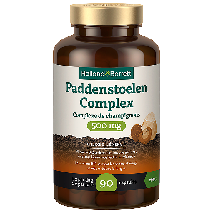 Paddenstoelencomplex met een mix van 6 paddenstoelensoortenMet cordyceps, lion’s mane, chaga, maitake, reishi en shittakeMet 84 mg mushroompoeder per soort en toegevoegde vitamine B12Wil je ontdekken wat mushrooms voor jou kunnen doen? Dan is dit paddenstoelencomplex met maar liefst 6 verschillende mushrooms een ideaal startpunt. Dit complex bevat per capsule 84 mg mushroompoeder van cordyceps, lion’s mane, chaga, maitake, reishi en shittake. Een hoogwaardige combinatie om de kracht van paddenstoelen te ervaren.Deze paddenstoelen bevatten stuk voor stuk waardevolle nutriënten en worden al eeuwenlang gebruikt voor verschillende toepassingen. Zo ondersteunt reishi het immuunsysteem en draagt het bij aan een gezonde bloedsomloop.* Aan dit supplement is ook vitamine B12 toegevoegd. Vitamine B12 ondersteunt het energieniveau en is goed bij vermoeidheid.De aanbevolen hoeveelheid van Holland Barrett Paddenstoelencomplex is 1 keer per dag 1-2 capsules met een glas water innemen, bij voorkeur tijdens de maaltijd. Overschrijd de aanbevolen dosering niet. In dit potje zitten 90 capsules, zodat je tot wel 3 maanden vooruit kunt. Holland Barrett Paddenstoelencomplex is geschikt voor vegans.De verpakking is gemaakt van 100% gerecycleerd plastic. Bovendien zijn pot en dop beide 100% recyclebaar.*Gezondheidsclaims in afwachting van goedkeuring door de Europese Commissie.
