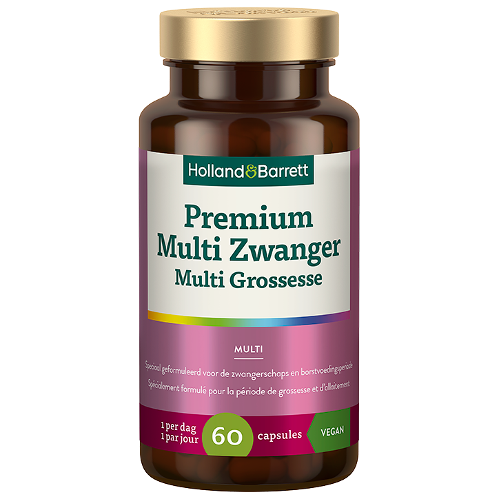 Premium multivitaminecomplex speciaal voor tijdens de zwangerschap en borstvoeding Bevat onder andere folaat, vitamine B12, D3, K2 en ijzer Folaat draagt bij tot de weefselgroei tijdens de zwangerschap Ben je op zoek naar een complete multivitamine ter ondersteuning van je zwangerschap of borstvoedingsperiode? Holland Barrett Premium Multi Zwanger is speciaal samengesteld met zorgvuldig geselecteerde vitaminen en mineralen die belangrijk zijn tijdens deze bijzondere fase. Deze vegan formule bevat onder andere 400 µg folaat, 5 µg vitamine B12, 7 mg ijzer en 5 µg vitamine D3 uit een plantaardige bron. Daarnaast is er vitamine K2 toegevoegd. De samenstelling is speciaal afgestemd op de verhoogde behoefte aan micronutriënten tijdens de zwangerschap en het geven van borstvoeding. Neem dagelijks 1 capsule, bij voorkeur tijdens of na de maaltijd. De verpakking is gemaakt van 100% gerecycleerd plastic. Bovendien zijn pot en dop beide 100% recyclebaar.