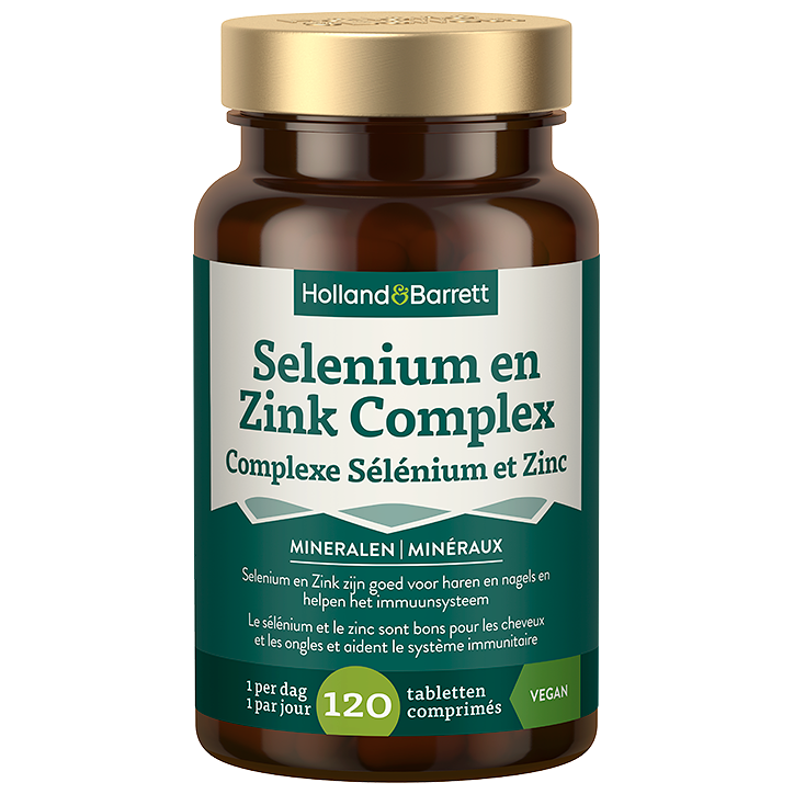 Veganistisch voedingssupplement met selenium en zinkSelenium en zink zijn goed voor de haren en nagelsDeze mineralen helpen het immuunsysteemHolland Barrett Selenium En Zink Complex bevat de twee belangrijke mineralen selenium en zink. Selenium en zink hebben allebei een anti-oxidatieve werking, wat betekent dat ze de lichaamscellen helpen beschermen tegen schadelijke invloeden van buitenaf. Zo helpen ze het natuurlijke afweersysteem van je lichaam en zorgen ze mede voor een goede weerstand.Selenium en zink houden daarnaast je haren sterk en zijn goed voor het behoud van glanzend haar. Het voordeel van selenium is daarnaast dat het goed is voor je nagels. Zoek je dus een fijne ondersteuning voor het behoud van gezond haar en nagels? Dan is dit supplement iets voor jou!Holland Barrett Selenium en Zink Complex bevat 120 veganistische tabletten per verpakking. Neem 1 tablet per dag, bij voorkeur bij de maaltijd. De verpakking is gemaakt van 100% gerecycleerd plastic. Bovendien zijn pot en dop beide 100% recyclebaar.
