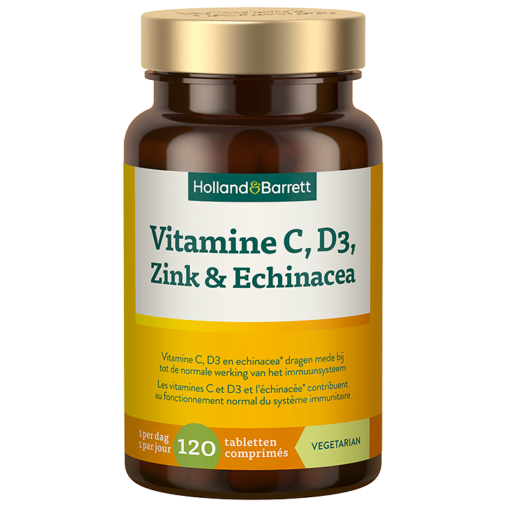 Vegetarisch voedingssupplement met vitamine C, D3, zink en EchinaceaVitamine C, D3 en Echinacea* dragen mede bij tot de normale werking van het immuunsysteemGeschikt voor vegetariërsHolland Barrett Vitamine C, D3, Zink Echinacea is een vegetarisch supplementencomplex dat jouw weerstand wat extra kan ondersteunen. Vitamine C, D3 en Echinacea* dragen namelijk alle drie mee bij tot de normale werking van het immuunsysteem. Echinacea, ook wel rode zonnehoed genoemd, komt oorspronkelijk uit Noord-Amerika, waar het al jarenlang traditioneel gebruikt wordt voor diverse doeleinden. Het supplement bevat vitamine C, ook wel ascorbinezuur genoemd. Ascorbinezuur komt ook van nature voor in onze voeding en wordt goed opgenomen door ons lichaam. Vitamine C is een antioxidant en helpt lichaamscellen te beschermen tegen invloeden van buitenaf. Zink ondersteunt de botten en speelt een belangrijke rol bij geestelijke inspanning en activiteit. Vitamine D heeft een positieve invloed op het immuunsysteem en is van belang voor het behoud van sterke tanden. Holland Barrett Vitamine C, D3, Zink Echinacea bevat 120 tabletten per verpakking. De aanbevolen dagdosering is 1 tablet per dag, bij voorkeur tijdens de maaltijd innemen. De verpakking is gemaakt van 100% gerecycleerd plastic. Bovendien zijn pot en dop beide 100% recyclebaar. *Voor Echinacea zijn de gezondheidsclaims nog in afwachting van goedkeuring door de Europese Commissie.