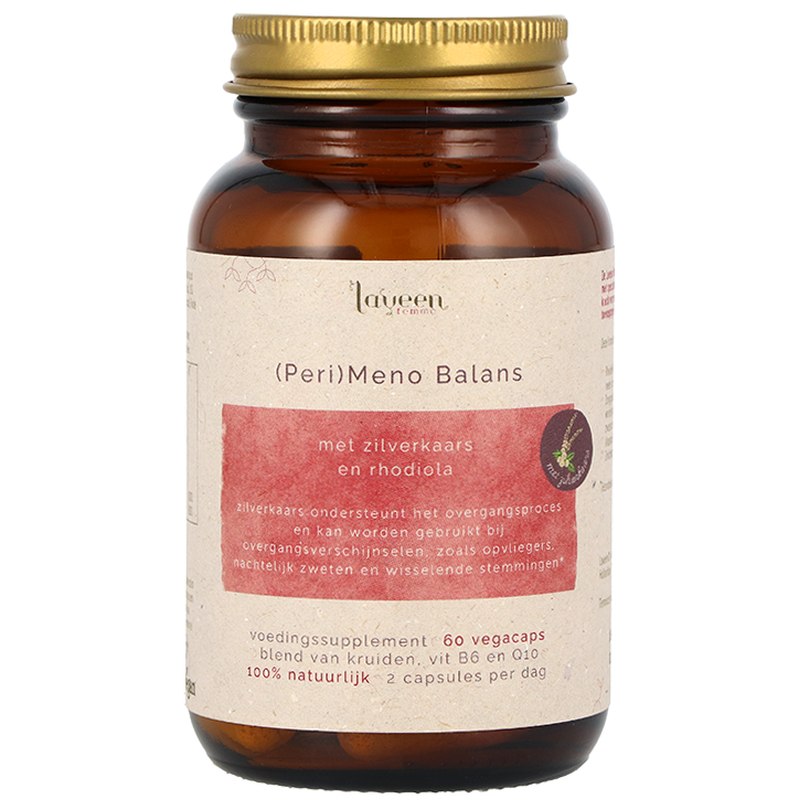 Plantaardig supplementencomplex met 6 kruiden, Q10 en vitamine B6 Dong quai en zilverkaars ondersteunen het overgangsproces en helpen bij typische overgangsverschijnselen* Zilverkaars kan worden gebruikt bij overgangsverschijnselen en ondersteunt het afweersysteem* Laveen Meno Balans is een zorgvuldig samengestelde formule voor vrouwen in de overgang. Deze unieke blend combineert plantenextracten zoals zilverkaars, rhodiola en dong quai met vitamine B6 en co-enzym Q10. De formule is 100% plantaardig en van ingrediënten van natuurlijke oorsprong, volledig vrij van onnodige toevoegingen volgens het Clean Label-principe van Laveen. Zilverkaars ondersteunt het overgangsproces en kan worden gebruikt bij overgangsverschijnselen zoals opvliegers, nachtelijk zweten en wisselende stemmingen.* Rhodiola helpt het lichaam omgaan met stress en ondersteunt de mentale veerkracht en het zenuwstelsel.* Dong quai draagt bij aan een gezond hart- en bloedvatenstelsel* en heeft een antioxidatieve werking.* Monnikspeper ondersteunt een normale menstruatie en hormonale balans.* Vitamine B6 (P5P) draagt bij aan een normaal psychologisch functioneren en helpt bij de regulatie van hormonale activiteit. Deze combinatie van plantenextracten en nutriënten biedt brede ondersteuning voor lichaam én geest tijdens de overgang. Neem dagelijks 2 capsules. *Gezondheidsclaims in afwachting van goedkeuring door de Europese Commissie.