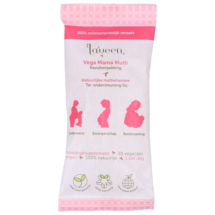 Natuurlijke, vegan multivitamine navulverpakkingVoor (aanstaande) moeders en voor tijdens de borstvoedingsperiodeMet o.a. folaatLaveen Vegan Mama Multi is een 100% natuurlijke multivitamine met vitamine C, E, D, K en verschillende B-vitamines, waaronder folaat (vitamine B11). Folaat is een belangrijke vitamine voor aanstaande moeders, want het draagt bij tot de groei van het ongeboren kind tijdens de zwangerschap. Naast al deze vitamines bevat deze multi ook mineralen zoals zink, ijzer en selenium.Deze vegan multivitamine voor vrouwen bevat geen suiker of andere toevoegingen. Laveen is in Nederland gemaakt en heeft een clean label-garantie: alle supplementen bevatten ingrediënten van natuurlijke oorsprong en zijn vrij van suiker. Alle supplementen van Laveen zijn duurzaam verpakt in donkerbruine, glazen flesjes en een doosje van karton.