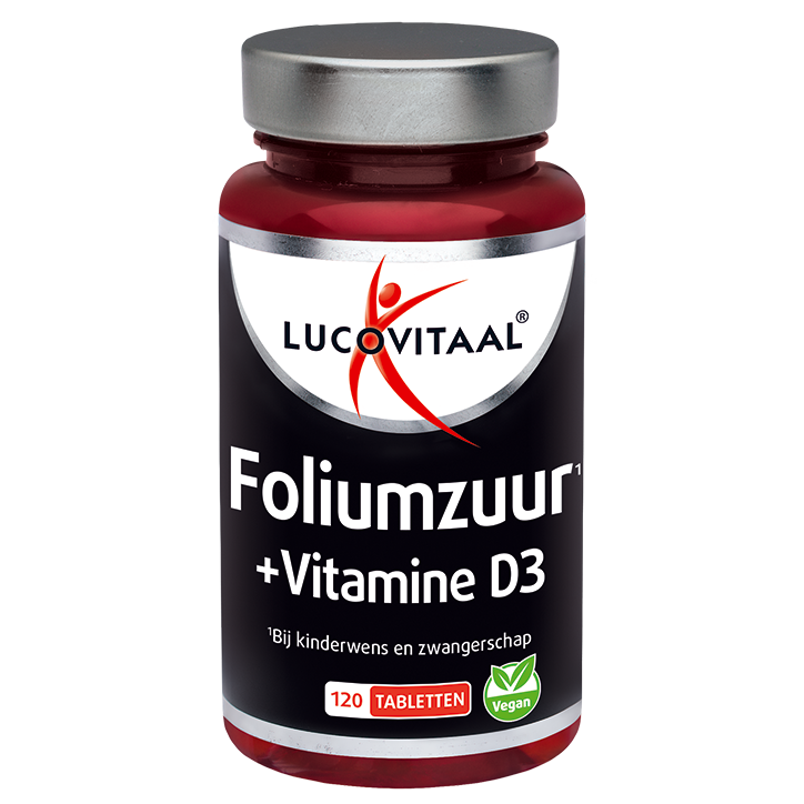 Tabletten met 400 µg foliumzuur en 10 µg vitamine D3 per tablet Foliumzuur draagt bij tot de groei van de foetus en de vorming van de placenta 100% vegan en geschikt bij kinderwens en zwangerschap Lucovitaal Foliumzuur + Vitamine D3 is een voedingssupplement dat speciaal is samengesteld voor vrouwen met een kinderwens en tijdens de zwangerschap. Foliumzuur draagt bij tot de groei van de foetus en tot de vorming van de placenta. Daarnaast ondersteunt foliumzuur de aanmaak van rode en witte bloedlichaampjes. De toevoeging van vitamine D3 (cholecalciferol) maakt deze formule compleet. Elke tablet bevat 400 µg foliumzuur en 10 µg vitamine D3, wat overeenkomt met 200% van de referentie-inname. De aanbevolen dosering is eenmaal daags 1 tablet met ruim water innemen. Start bij voorkeur minimaal 4 weken vóór de bevruchting en gebruik het supplement tot 10 weken na de bevruchting. Overschrijd de aanbevolen dagelijkse dosering niet. De verpakking bevat 120 tabletten, goed voor 120 doseringen.