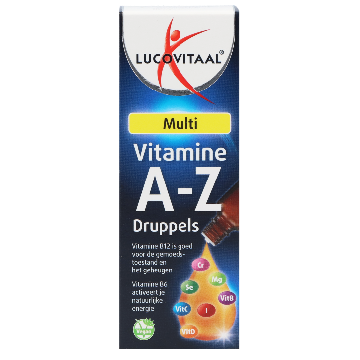 Vegan multivitamine die speciaal is ontwikkeld voor mannen en vrouwenIn een handige druppelvormBevat een breed spectrum aan vitamines en mineralenLucovitaal Multi A t/m Z Druppels bevat een breed spectrum aan vitamines, waaronder vitamine A, vitamine B1, vitamine B2, vitamine B6, vitamine B12, vitamine D, vitamine E en vitamine K. Deze vitamines zijn belangrijk voor verschillende functies in het lichaam.Vitamine B12 activeert je natuurlijke energie in het lichaam. Vitamine K ondersteunt de bloedstolling en is goed voor het behoud van sterke botten. Vitamine B2 bevordert de beschikbaarheid van ijzer uit lichaamsvoorraden. De druppels bevatten ook mineralen, waaronder chroom, jodium en mangaan. Mangaan is een mineraal en levert een bijdrage als antioxidant. Mangaan helpt de lichaamscellen te beschermen tegen invloeden van buitenaf. De druppels kunnen een handige manier zijn om aan de dagelijkse behoefte aan vitamines en mineralen te voldoen.Lucovitaal Multi A t/m Z Druppels is geschikt voor vegetariërs en veganisten. De aanbevolen dagdosering voor volwassenen is 2 keer per dag 10 druppels. Voor kinderen tussen de 4 en 17 jaar oud is de aanbevolen dosering 2 keer per dag 5 druppels. De druppels kunnen puur worden gedoseerd (door ze op een lepel te druppelen) of je kunt ze mengen door het eten of wat drinken. Het is belangrijk om de aanbevolen dagelijkse dosering niet te overschrijden.