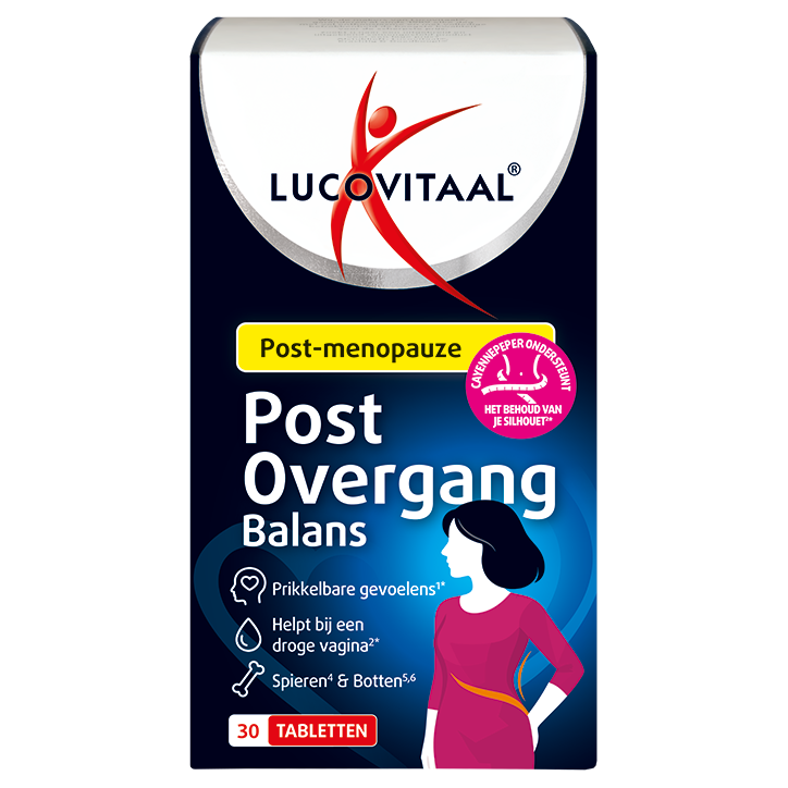 Kruiden-, vitaminen- en mineralenpreparaat speciaal samengesteld voor vrouwen in de postmenopauze Maca ondersteunt bij prikkelbare gevoelens en is goed voor emotioneel evenwicht* Met vitamine D3, wat goed is voor de spieren Lucovitaal Post Overgang Balans is een kruiden-, vitaminen- en mineralenpreparaat dat is afgestemd op de behoeften van vrouwen in de fase na de overgang. De formule combineert zorgvuldig geselecteerde plantenextracten met calcium en vitamines D3 en K2. Maca draagt bij aan de gemoedstoestand en het emotionele evenwicht en ondersteunt bij prikkelbare gevoelens.* Cayennepeper is toegevoegd ter ondersteuning van het behoud van het silhouet.* Duindoornbesextract wordt traditioneel gebruikt ter ondersteuning van slijmvliezen en draagt bij aan het comfort bij een droge, gevoelige huid en vagina.* Daarnaast bevat de formule calcium, vitamine D3 en vitamine K2. Calcium en vitamine D ondersteunen het behoud van sterke botten en spieren, terwijl vitamine K2 bijdraagt aan de opname van calcium in de botten en de instandhouding van sterke botten. De aanbevolen dosering is 1 keer per dag 1 tablet, in te nemen met ruim water. De verpakking bevat 30 tabletten en is dus goed voor 30 doseringen. Overschrijd de aanbevolen dagelijkse dosering niet. *Gezondheidsclaims in afwachting van goedkeuring door de Europese Commissie.