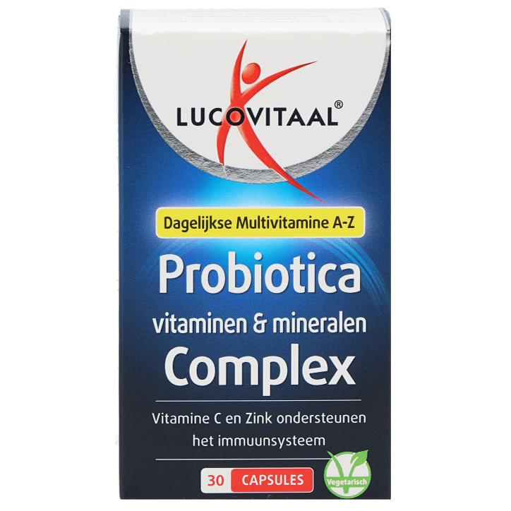 Vegetarisch voedingssupplement met probiotica, vitaminen en mineralenBevat zes zorgvuldig geselecteerde bacteriestammenVitamine C en zink ondersteunen het immuunsysteemLucovitaal Probiotica Vitaminen Mineralen Complex is een voedingssupplement dat zes zorgvuldig geselecteerde bacteriestammen bevat, samen met een mix van verschillende vitaminen en mineralen.De B-vitaminen B1, B2, B3 en B8 zijn belangrijk voor het energiemetabolisme. Mangaan is goed voor de aanmaak van kraakbeen (in de gewrichten) en jodium helpt bij de verzorging van de huid van binnenuit. Vitamine B3 en B5 kunnen het gebrek aan energie helpen te verminderen. Vitamine A, C en D hebben een positieve invloed op het immuunsysteem, net als de mineralen ijzer en zink. Bovendien bevat deze speciale formule zes geselecteerde bacteriestammen: Bifidobacterium breve, Bifidobacterium lactis , Bifidobacterium longum, Lactobacillus acidophilus, Lactobacillus plantarum en Streptococcus thermophilus. De zorgvuldig gekozen bacteriestammen overleven de zure omgeving van de maag en bereiken de darmen.Lucovitaal Probiotica Vitaminen Mineralen Complex is geschikt voor vegetariërs en bevat 30 capsules per verpakking. Neem dagelijks 1 capsule in met voldoende water. Overschrijd de aanbevolen dagelijkse dosering niet.