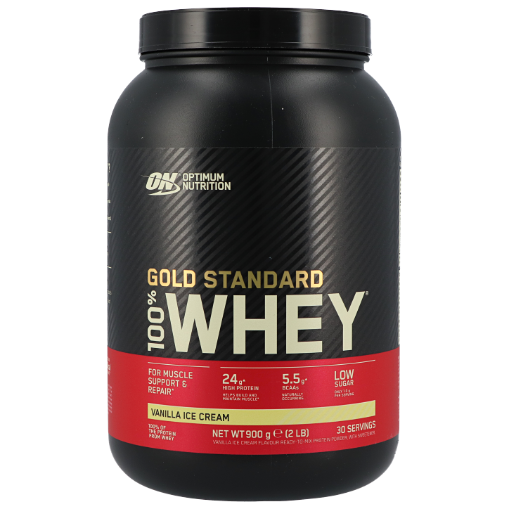 Premium wei-eiwit voor spierondersteuningWeinig suiker en minder dan 120 calorieënMet de romige smaak van vanille-ijsGold Standard Vanilla Ice Cream heeft de volle, roomachtige smaak van vanille-ijs. Dankzij de romige textuur van Gold Standard 100% Whey maak je een heerlijk smakende eiwitshake, die helpt om nog meer uit je trainingsresultaten te halen.Gold Standard 100% Whey is een mix van hoogwaardig wei-eiwit isolaat, concentraat en hydrolysaat. Wei-eiwit is een snel verteerbare ‘complete’ eiwitbron die alle essentiële aminozuren bevat, waaronder 5,5 g natuurlijk voorkomende aminozuren met vertakte keten (BCAA’s) en 4 g natuurlijk voorkomende glutamine en glutaminezuur.Meng 30-60 minuten na je training een maatschepje (30 g) in 180-240 ml water. Of maak op elk moment van de dag een lekkere shake voor jezelf. Het poeder is laag in suikers en vetten.