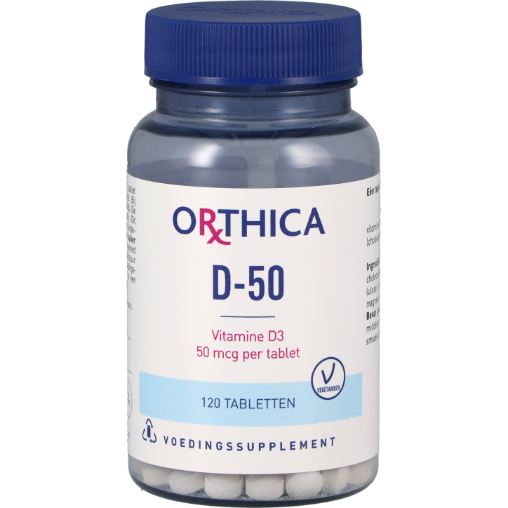 Hooggedoseerde vitamine D-supplementVitamine D helpt je botten en tanden sterk te houdenVitamine D ondersteunt je immuunsysteemKrijg je weinig zonlicht op je huid of kom je weinig buiten? Dan is dit vitamine D-supplement een goede optie voor je. Orthica D 50 is een hooggedoseerd vitamine D-supplement dat je als aanvulling op je voeding kunt gebruiken. Vitamine D heeft een positieve invloed op het immuunsysteem en verhoogt de calciumopname, wat bijdraagt aan de instandhouding van sterke botten en tanden. Daarbij ondersteunt vitamine D de normale werking van de spieren en speelt het een rol in het proces van weefselgroei. Vitamine D is een in vetoplosbare vitamine welke door het lichaam aangemaakt kan worden door de werking van (zon)licht op de huid. Voedingsbronnen die vitamine D bevatten zijn onder andere vette vis en melkproducten.