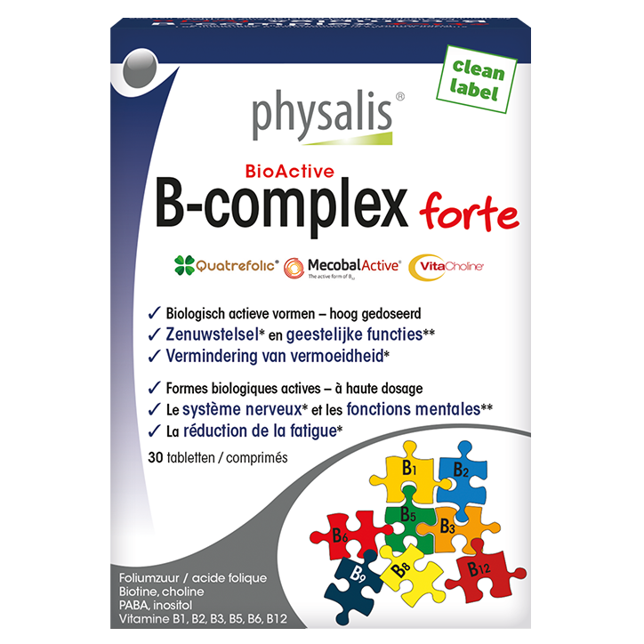 Hooggedoseerd vitamine B-complexBevat alle belangrijke B-vitaminesVitamine B12 draagt bij tot de vermindering van vermoeidheidPhysalis B-Complex Forte is een hooggedoseerd vitamine B-complex dat alle belanrijke B-vitaminen bevat: vitamine B1, B2, B3, B5, B6, B12, biotine en foliumzuur (folaat), aangevuld met VitaCholine®, inositol en PABA. Vitamine B2, B3, B5, B6 en B12 helpen om vermoeidheid te verminderen en hebben een positieve invloed op de werking van het zenuwstelsel. Daarnaast ondersteunt biotine (vitamine B8) het energieniveau, helpt het bij het gezond houden van de huid en is het goed voor je haren. Folaat (vitamine B11) helpt het immuunsysteem en draagt bij aan de weerstand tegen stress.