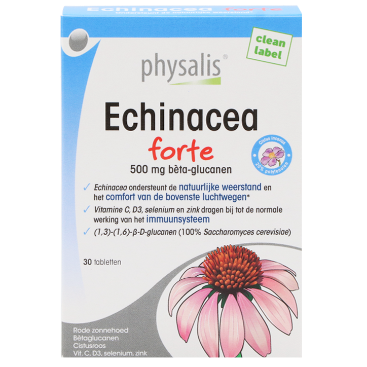 Planten-, mineralen- en vitaminencomplexBevat o.a. echinacea, zink, selenium en vitamine CVitamine C draagt bij tot de normale werking aan het immuunsysteemEchinacea Forte tabletten van Physalis bestaan uit een combinatie van diverse planten extracten, waaronder Cistusroos, Echinacea en Astragalus. Echinacea zorgt mede voor een goede weerstand*. Aan het complex zijn ook mineralen en vitaminen toegevoegd. De mineralen zink en selenium en vitamine C helpen je lichaam beschermen tegen schadelijke invloeden van buitenaf. Vitamine D3 draagt daarnaast bij tot een goede weerstand en het behoud van sterke spieren en botten.*Gezondheidsclaim in afwachting van goedkeuring door de Europese Commissie.