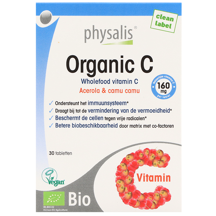 Laaggedoseerd vitamine C supplementBevat 3 biologische extracten die van nature vitamine C bevattenVitamine C heeft een positieve invloed op het immuunsysteemPhysalis Organic Vitamine C 200mg is een hoogwaardig complex van 3 gestandaardiseerde en biologische extracten. Amla (Indische ganzenbes), camu camu en acerola (West-Indische kers) bevatten van nature vitamine C.Vitamine C ondersteunt het immuunsysteem, draagt bij tot de vermindering van vermoeidheid, ondersteunt de energiestofwisseling en verhoogt de ijzeropname. Daarnaast draagt vitamine C onder andere bij aan de vorming van collageen wat van belang is voor de huid.