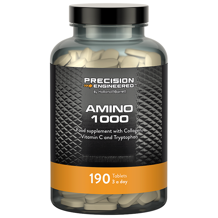 Geavanceerd aminozuursupplement verrijkt met gehydrolyseerd collageen, vitamine C en L-tryptofaan Vitamine C helpt bij vermoeidheid Aangevuld met 45 mg L-ornithine Ontdek de kracht van Precision Engineered Amino 1000, een door Holland Barrett ontwikkeld supplement dat essentiële aminozuren combineert met onder meer collageen en vitamine C als aanvulling op een gezond en gevarieerd dieet. Elke tablet bevat een krachtige mix van ingrediënten. Met 3000 mg gehydrolyseerd rundercollageen, 45 mg L-ornithine en 30 mg L-tryptofaan per dagelijkse dosis van 3 tabletten, is dit supplement vooral populair bij sporters. De toegevoegde vitamine C helpt bij vermoeidheid, bevordert de weerstand tijdens en na fysieke inspanning en draagt bij tot de normale collageenvorming voor de normale werking van het kraakbeen. Gebruik: Neem dagelijks drie tabletten, bij voorkeur bij een maaltijd.
