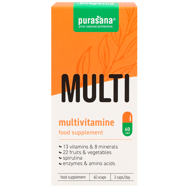 Compleet multivitaminesupplement met 13 vitamines, 8 mineralen in goed opneembare vorm en plantenextractenBevat 22 soorten fruit- en groentenpoeders, spirulina, enzymen en aminozurenIdeaal voor dagelijks gebruikPurasana Multi is een uitgebreide formule die 13 vitamines en 8 mineralen combineert met een unieke mix van 22 fruit- en groentesoorten, spirulina en enzymen. Deze capsules zijn speciaal ontwikkeld om de dagelijkse voedingsbehoeften als aanvulling op een gezonde en gevarieerde voeding.Inhoud van de verpakking: Elke capsule bevat essentiële vitamines zoals vitamine A, C, D, E en een volledig B-complex. Daarnaast bevat het magnesium, zink, selenium en andere mineralen die bijdragen aan tal van functies in het lichaam. Gebruiksaanwijzing: Neem 2 capsules per dag tijdens de maaltijd. Het supplement is vrij van cafeïne en bevat natuurlijke ingrediënten zoals oxynea®️, een fruit- en groentemix. Bewaar op een koele en droge plaats, buiten direct zonlicht.Geschikt voor volwassenen en kinderen vanaf 12 jaar. Niet geschikt voor jonge kinderen. Controleer de maximale dagelijkse inname van actieve ingrediënten veilig binnen de aanbevolen grenzen te blijven.