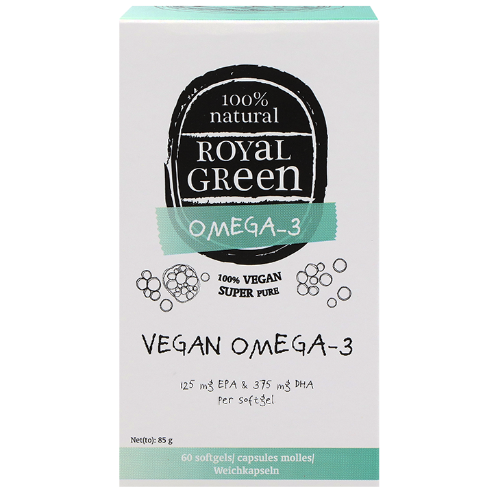 Zachte capsules met een 100% plantaardige bron van omega 3-vetzuren (EPA DHA) DHA is goed voor het gezichtsvermogen en voor de hersenen (bij een dagelijkse inname van 250 mg) Gemaakt van microalgenolie, niet van vis Royal Green Vegan Omega 3 is een volledig plantaardig alternatief voor traditionele visolie, gemaakt van microalgen (Schizochytrium sp.). Deze unieke formule levert de essentiële omega 3-vetzuren EPA en DHA in hun natuurlijke vorm, rechtstreeks uit de oorspronkelijke bron waaruit vissen ze zelf halen. Een dagelijkse inname van minimaal 250 mg EPA en DHA is goed voor het hart, terwijl een dagelijkse inname van 250 mg DHA bijdraagt aan het behoud van een normale hersenfunctie en goed is voor het gezichtsvermogen. Deze softgels bevatten geen kunstmatige toevoegingen of dierlijke ingrediënten. Neem dagelijks 1 softgel, bij voorkeur tijdens de maaltijd. De aanbevolen dagelijkse dosering niet overschrijden. Niet geschikt voor kinderen onder de 18 jaar. Niet gebruiken tijdens zwangerschap of borstvoeding.
