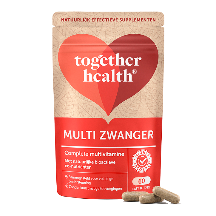 Vegan multivitamine voor tijdens je zwangerschapBevat onder meer foliumzuur, vitamine A, vitamine K2 en calciumVrij van kunstmatige toevoegingen en pesticidenTijdens je zwangerschap is het belangrijk dat je genoeg vitaminen binnenkrijgt. Vooral vitamine B11 (foliumzuur), vitamine D3 en calcium zijn belangrijk. Met Together Health Multi Zwanger krijg je de benodigde vitamines binnen. Folaat draagt bij tot de groei van het ongeboren kind tijdens de zwangerschap. Vitamine D3 zorgt ervoor dat calcium goed uit je voeding wordt opgenomen. Calcium zorgt voor de instandhouding van sterke botten en tijdens je zwangerschap is dit extra belangrijk.Het merk Together Health staat voor pure ingrediënten en onbewerkte producten. Together Health is vegan, plasticvrij en de ingrediënten zijn van de hoogste kwaliteit. De verpakkingen zijn bovendien volledig composteerbaar. Elk ingrediënt van Together Health wordt uitgebreid getest op de werking voor je gezondheid. Het merk is een uitstekende keuze als je verantwoorde, vegan supplementen wilt slikken.Together Health Multi Zwanger capsules zijn 100% vegan en met zorg samengesteld. Naast foliumzuur, vitamine D3 en calcium bevat Together Health Multi Zwanger onder meer jodium, selenium, zink, ijzer en vitamine B1 en B2. De aanbevolen hoeveelheid is 2 capsules per dag, ter aanvulling op een gevarieerde voeding.