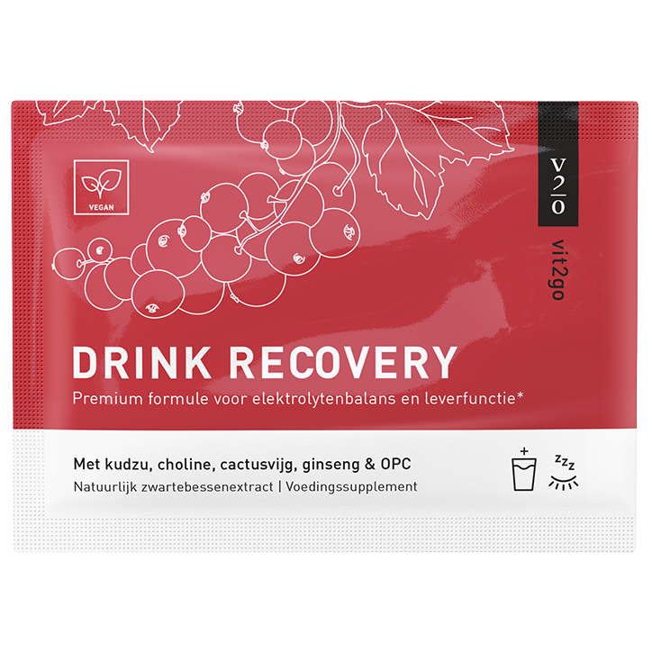 Drink recovery supplement met natuurlijk zwarte bessenextractGebaseerd op wetenschappelijk onderzoek en met 22 verschillende nutriëntenVegan, premium formule voor de elektrolytenbalans en leverfunctieDe avond was top, maar de ochtend een flop. Herkenbaar? Dat typische ‘morning after’-gevoel na een nachtje stappen is volledig normaal. Je lichaam heeft namelijk veel vocht en voedingstoffen verloren, een gevolg van de alcoholische drankjes waarvan je er misschien net iets te veel hebt gedronken. Je lichaam is hard aan het werk om de stoffen af te breken, waardoor jij je niet top voelt.Bereid je in het vervolg goed voor en blijf dag en nacht fit met Vit2Go Drink Recovery anti-kater middel. Help je lichaam een handje door de belangrijkste vitaminen, mineralen en essentiële aminozuren voor het drinken, voor het slapengaan of de volgende dag in te nemen. Met één zakje anti-kater poeder van Drink Recovery vul je jouw reserves aan en geef je jouw lichaam een extra portie nutriënten in aanvulling op een gezonde voeding.Vit2Go anti-kater drankje is volledig plantaardig, 100% vegan-proof en de formule is gebaseerd op wetenschappelijk onderzoek. Het bevat maar liefst 22 verschillende vitamines, mineralen, kruiden en aminozuren, waaronder kudzu, cactusvijg, druivenpitextract, ginseng, L-cysteïne, choline, zink en magnesium. Choline draagt bij aan het behoud van een normale leverfunctie, terwijl magnesium bijdraagt aan de balans in elektrolyten. Vitamine C, B2, B6, B12 en niacine dragen bij aan het verminderen van vermoeidheid.Meng een zakje Vit2Go Drink Recovery met minstens 200 ml water. Neem Drink Recovery op het moment dat het best voor jou past: voor het drinken, voor het slapengaan of de ochtend na het drinken. De aanbevolen hoeveelheid van 1 zakje per dag niet overschrijden