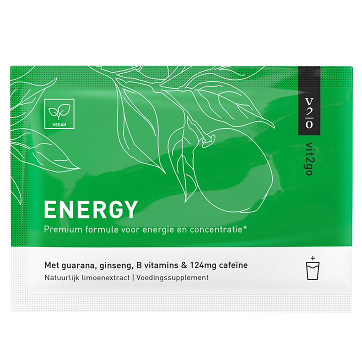 Energy supplement met natuurlijk limoenextractGebaseerd op wetenschappelijk onderzoek en met 25 verschillende nutriëntenVegan, premium formule voor energie en concentratieEen belangrijke dag op het werk, een moeilijk examen of een beslissende sportwedstrijd: Vit2Go is er voor die momenten waarop je een extra duwtje in de rug kan gebruiken. Vit2Go Energy is volledig plantaardig, 100% vegan-proof en de formule is gebaseerd op wetenschappelijk onderzoek. Het bevat maar liefst 25 verschillende vitamines, mineralen, kruiden en aminozuren, waaronder guarana, ginseng, B-vitaminen, cafeïne en taurine.Pantotheenzuur, ook wel bekend als vitamine B5, draagt bij aan normale mentale prestaties. Vitamine B12 draagt bij aan een normale werking van het zenuwstelsel. Vitamine B1, B2, niacine, pantotheenzuur, biotine, B6, B12 en calcium dragen bij aan een normaal energieleverend metabolisme. Magnesium, vitamine B1, niacine, vitamine B6, biotine, vitamine B12 en vitamine C zijn goed voor de gemoedstanstand, de leerprestatie, het concentratievermogen en het geheugen.Meng een zakje Vit2Go Drink Recovery met minstens 400 ml water. De aanbevolen hoeveelheid van 1 zakje per dag niet overschrijden. Dit product is niet geschikt voor zwangere vrouwen, personen die antidepressiva gebruiken of aan nierinsufficiëntie lijden.