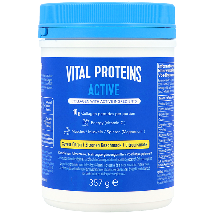 ‘Active’ collageenpeptidenpoeder met citroensmaak Verrijkt met actieve ingrediënten zoals calcium, magnesium, zink, vitamine C, D en B-vitaminen Vitamine C, B2 en B6 ondersteunen het energieniveau, magnesium draagt bij aan een normale spierfunctie en vitamine C draagt bij tot de normale collageenvorming Vital Proteins Active Citroen is een collageenpoeder met een frisse citroensmaak, speciaal ontwikkeld voor mensen die actief willen blijven. De formule bevat rundercollageenpeptiden, wat de zichtbare tekenen van veroudering vermindert. Naast collageen is dit supplement verrijkt met vitamine C, dat bijdraagt aan de normale collageenvorming voor de normale functie van botten en kraakbeen. Verder is er calcium, magnesium, zink, vitamine B2, B6, C en D aan dit collageencomplex toegevoegd. Vitamine C, B2 en B6 ondersteunen het energieniveau, terwijl magnesium goed is voor de spieren. Of je nu actief bezig bent of graag goed voor jezelf zorgt: dit collageenpeptidenpoeder is een makkelijke manier om je dagelijkse routine aan te vullen. Los het eenvoudig op in water en geniet van de frisse citroensmaak op elk moment van de dag.