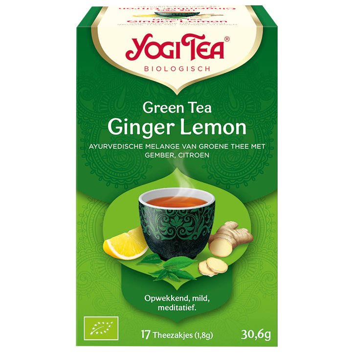 Yogi Tea Green Tea Ginger Lemon is een zachte 100% biologische groene thee. De groene thee voegt een teder, meditatief tintje toe aan de pittigheid van de gember. De zoete fruitigheid van citroen mirte en citroengras in combinatie met frisse pepermunt brengen deze groene thee op een nog hoger niveau door haar een verfijnd, verfrissend tintje te geven. De essentie van deze thee is: ‘Alertheid en openheid’.